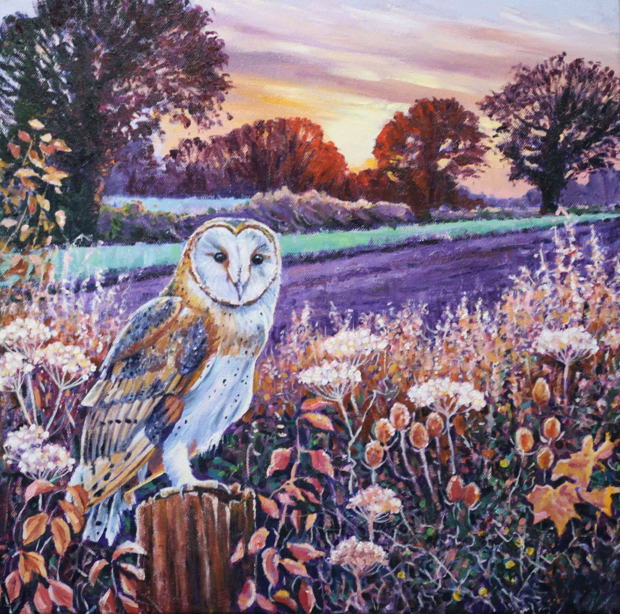 This commission was created especially for my collector who loves barn owls. The landscape was chosen as it had special significance for her and I took lots of photographs around dawn to help me with the light and composition.