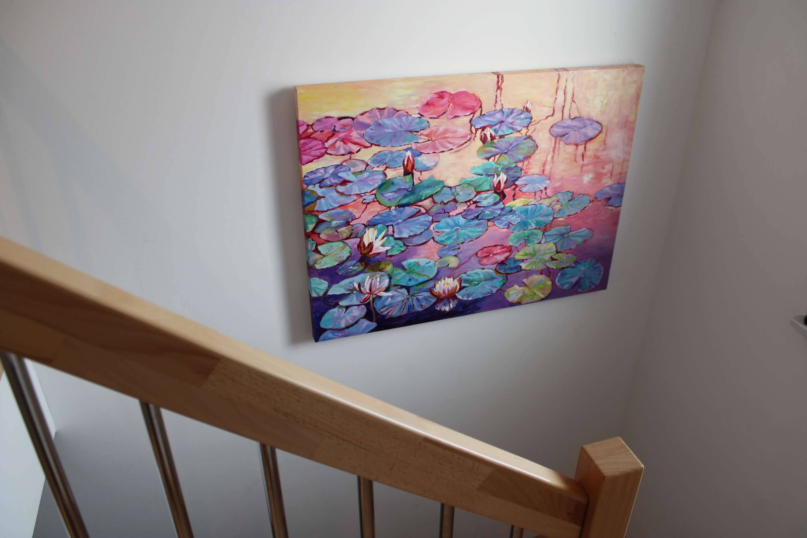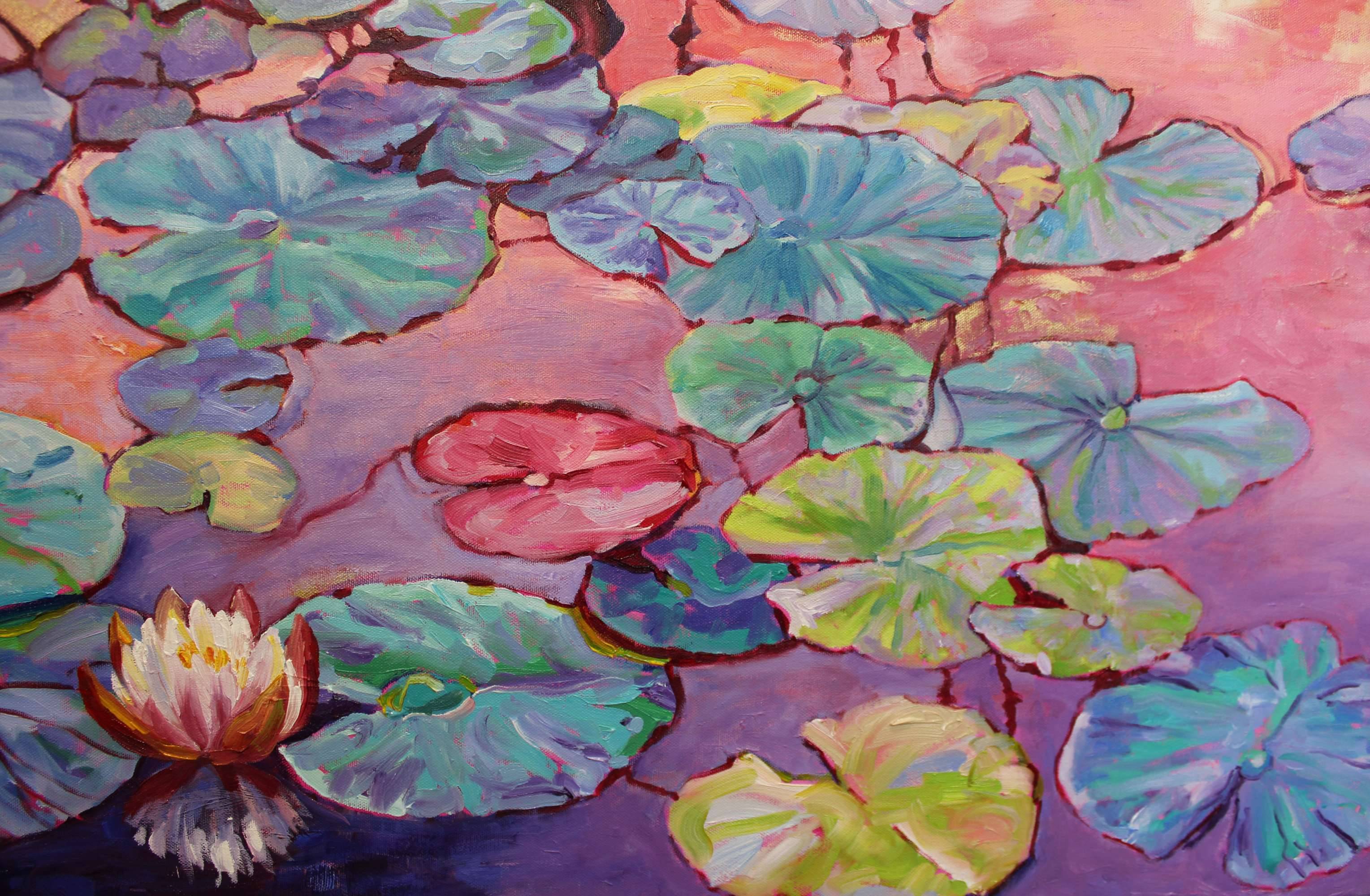 Nympheas was painted with thick impasto paint and lively expressive brushstrokes in shades of warm apricots and pinks juxtaposed against turquoise and lilac tones with gold leaf highlights. Stately white water lily flowers take center stage in this dramatic and unique piece of art.