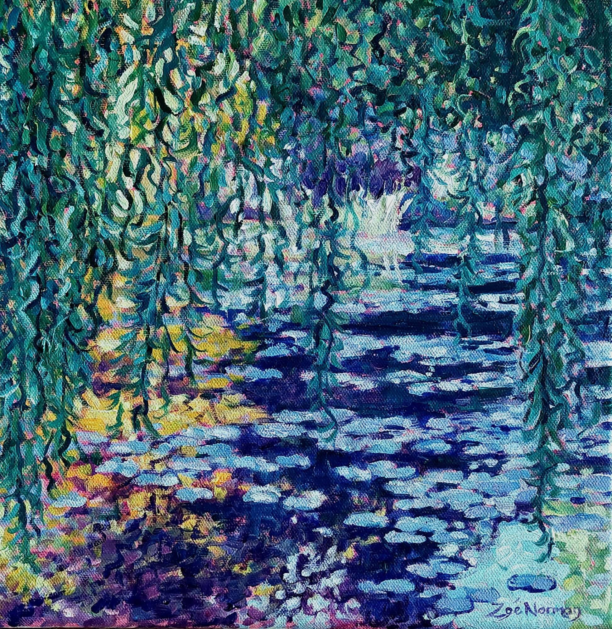 Inspired by the great impressionist painter Claude Monet. This painting was completed in the studio from my own reference material gathered while visiting Monet's iconic garden in Giverny, France. Rustling willow leaves hanging over the shimmering waterlily pond at Giverny. Painted with lively brush strokes in vibrant hues of green, lemon and mauve.