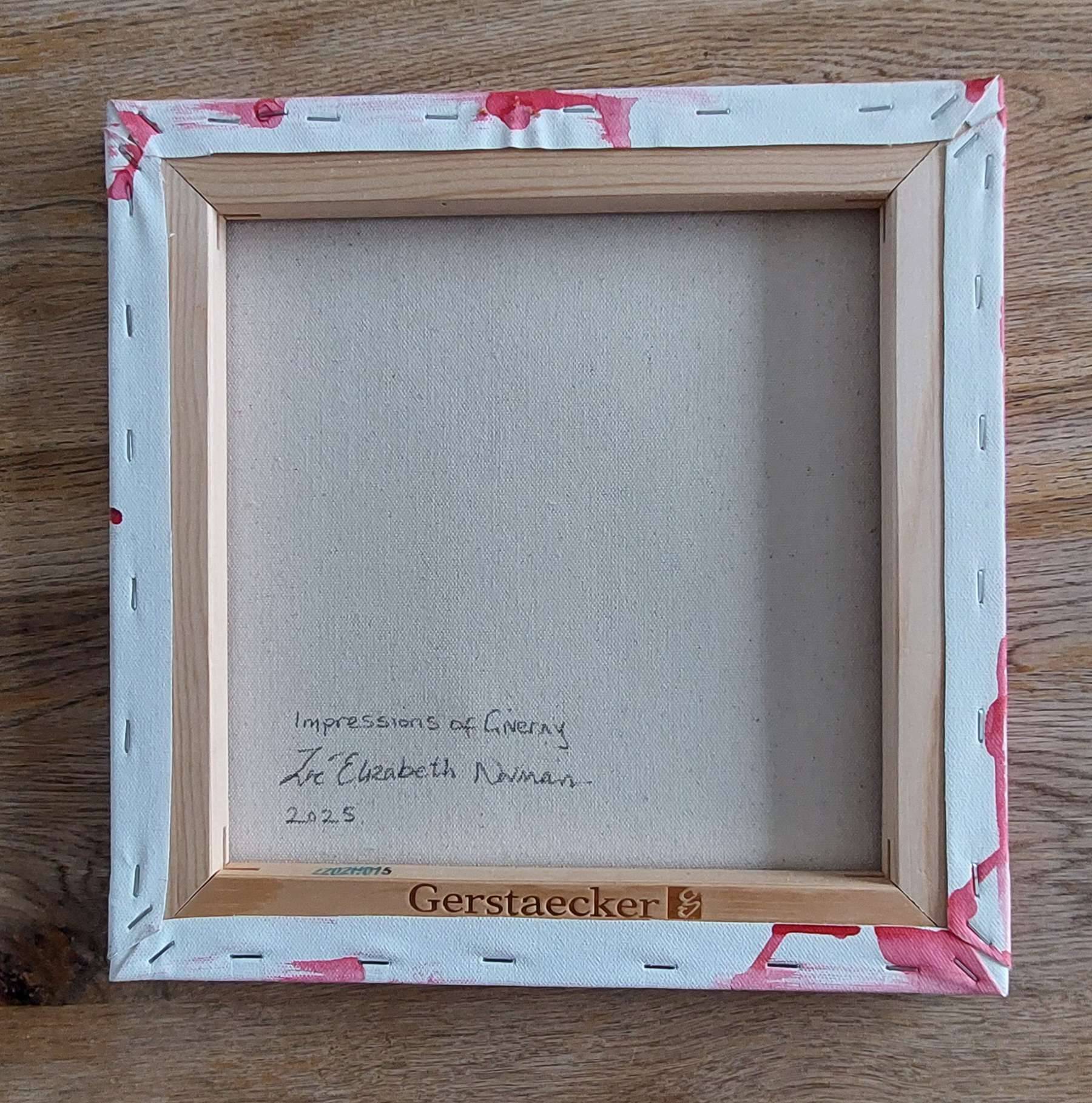 This painting was completed in the studio from my own reference material gathered while visiting Monet's iconic garden in Giverny, France. Rustling willow leaves hanging over the shimmering waterlily pond at Giverny. Painted with lively brush strokes in vibrant hues of green, pink and mauve.
