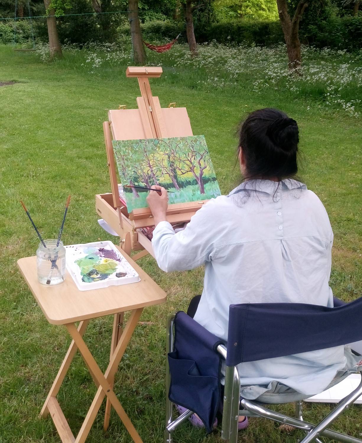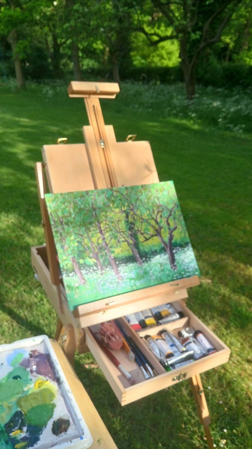 I painted this view of the apple orchard at the end of my garden. It was a very hot sunny day so I positioned myself under the shade of a tree. I loved all the cow parsley and the dappled light on the tree trunks.