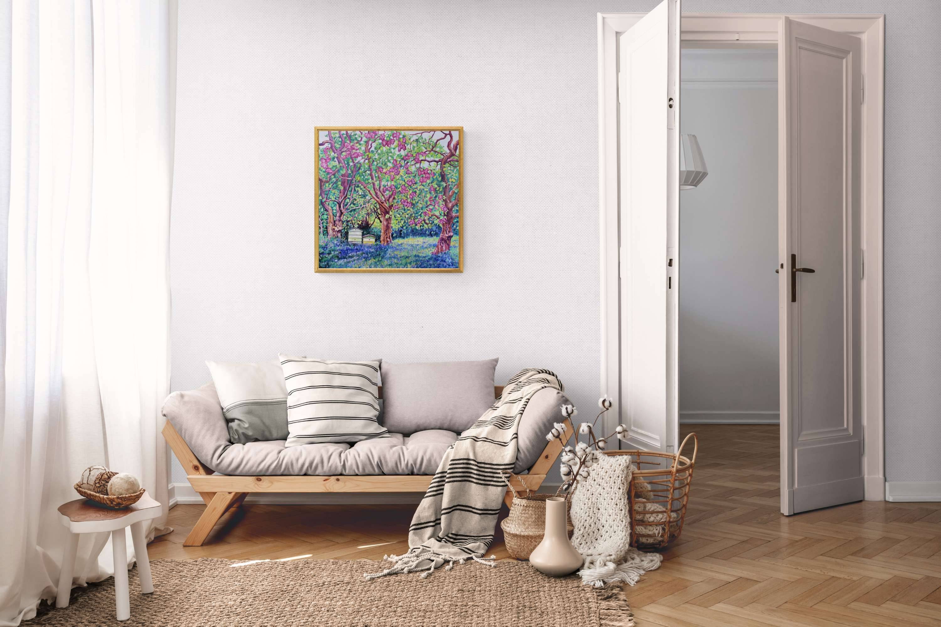This was quite a complicated painting to complete with all the different elements. The painting is a lively contemporary depiction of an old country scene in spring. The bees are buzzing and collection nectar from the fragrant lilac and bluebells and the ancient gnarled lilac trees cast their shadows and mystery.