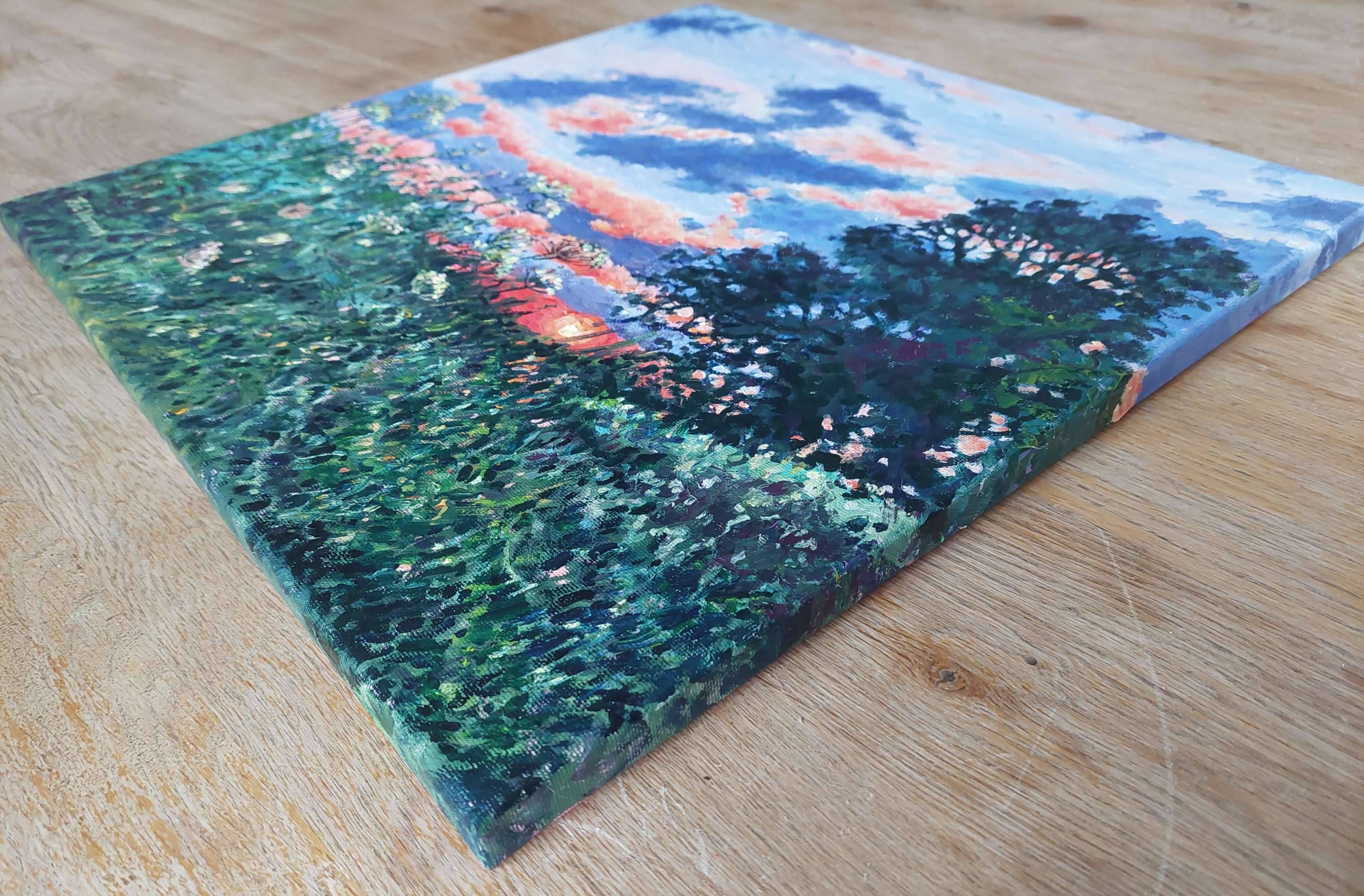 Summer evening with swaying umbers and grasses at sunset. I was driving home and had to stop to capture this beautiful sky. Once home I set to work in oil paints to capture this delightful scene.