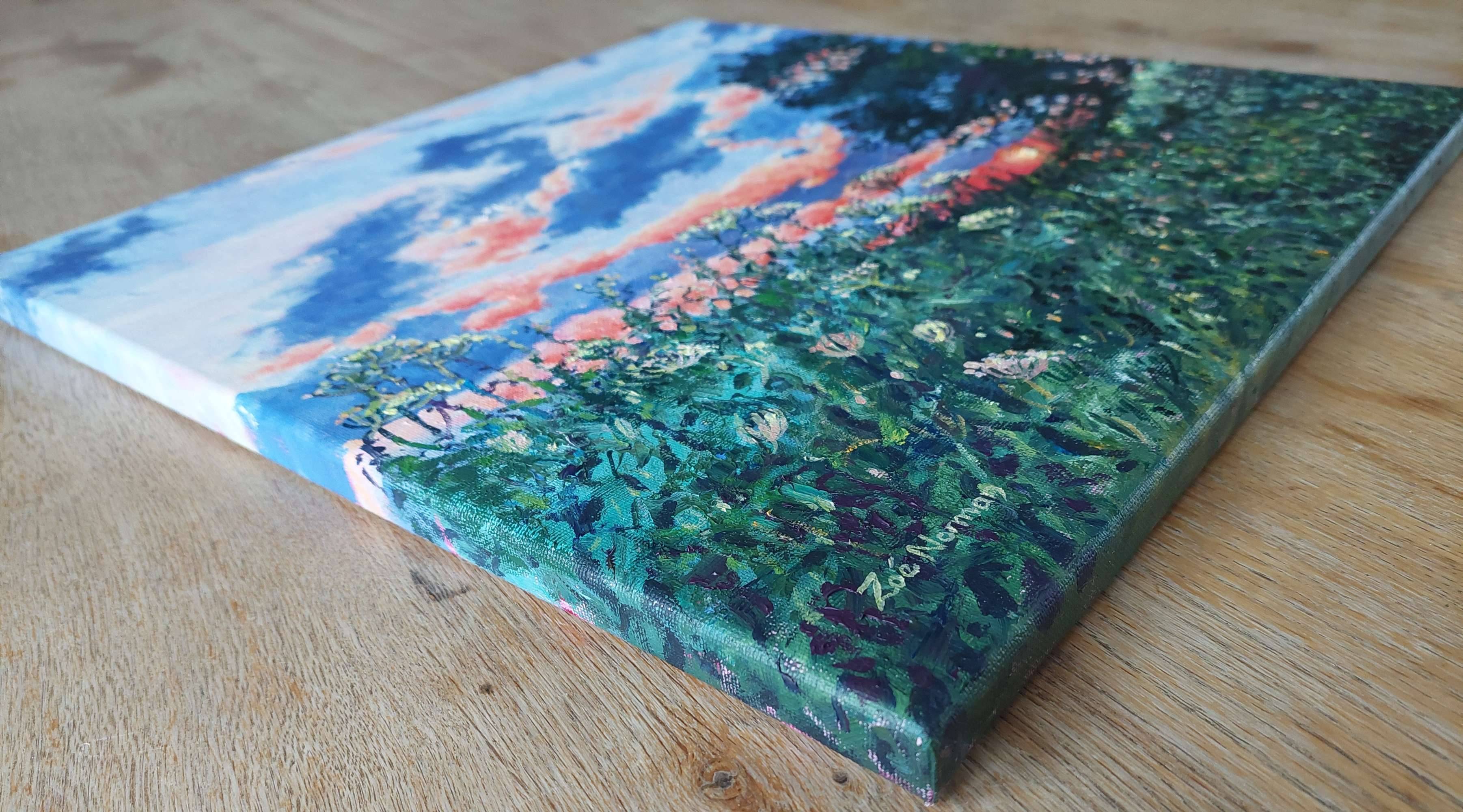Signed on the front and accompanied by a certificate of authenticity. The painting continues around the edges so framing is optional.