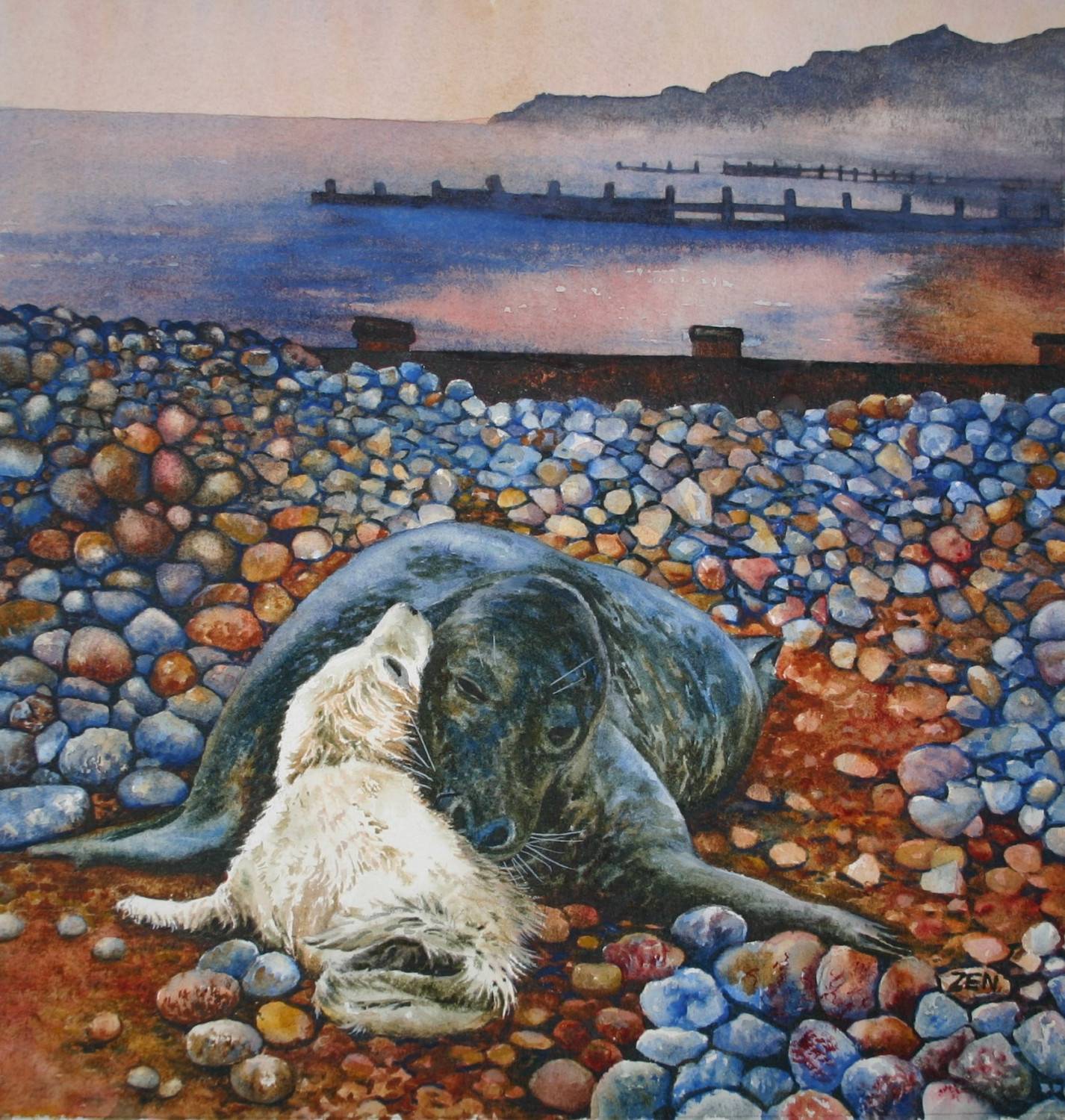 Mother seals leave their pups for many hours while they hunt at sea. The pups stay on the beach and wait. I was very lucky to witness this magical reunion between mother and pup and decided this would be my first seal painting. I worked from sketches and photographs taken at Cromer Beach and Horsey Beach both on the North Norfolk coast and have given the scene a pink morning glow.