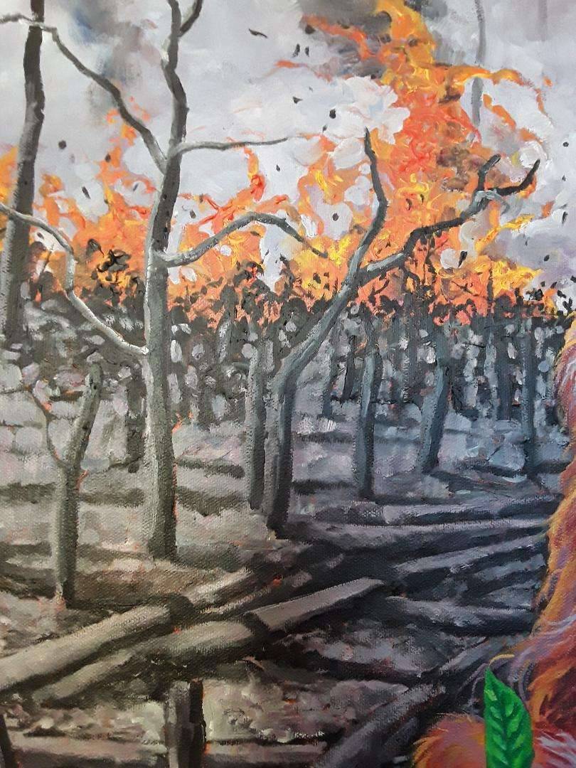 My painting highlights the sad plight of Indonesia and Borneos orangutan population. The destruction and clearing of rainforest, fuelled by our greed for cheap junk food supplied to us by manufacturers including Kellogs, Nestle, Walls and Mars is responsible for this tragic catastrophe.