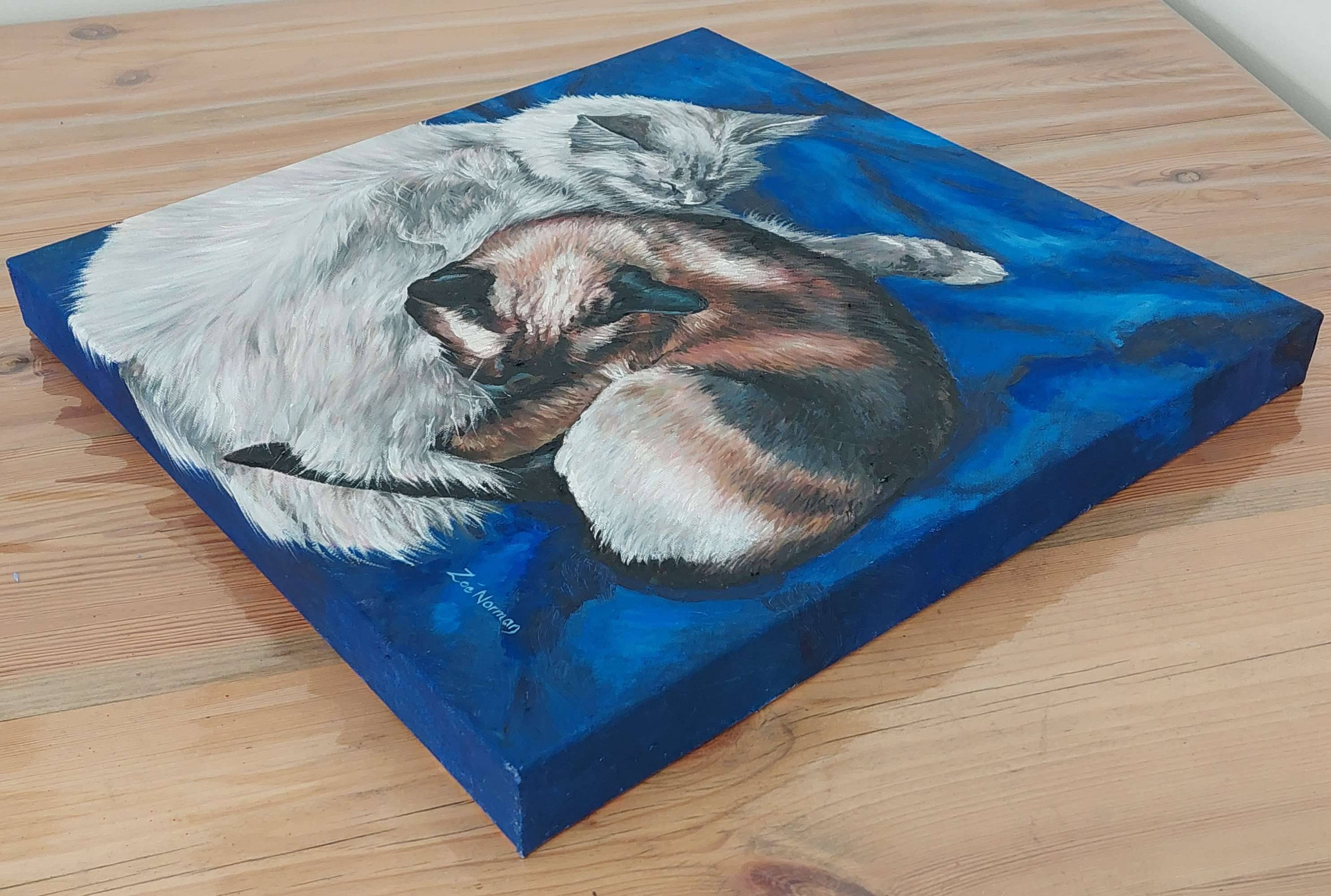 The artists two cats Rupert and Lily fast asleep on a blue blanket. Lily is a little traditional Siamese cat and Rupert a big fluffy Rag Doll. They are inseparable and spend all their time together, either playing, sleeping, or grooming.