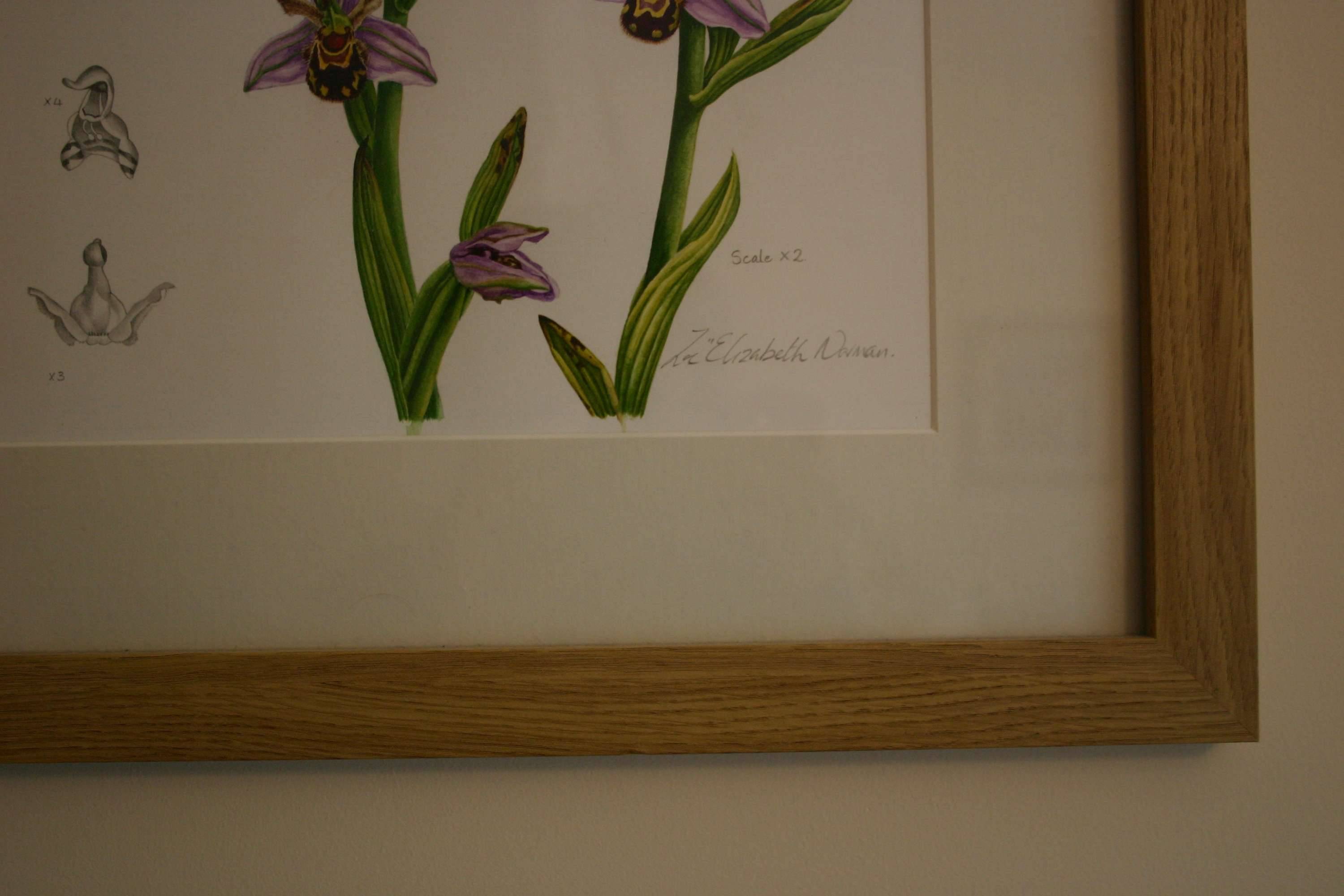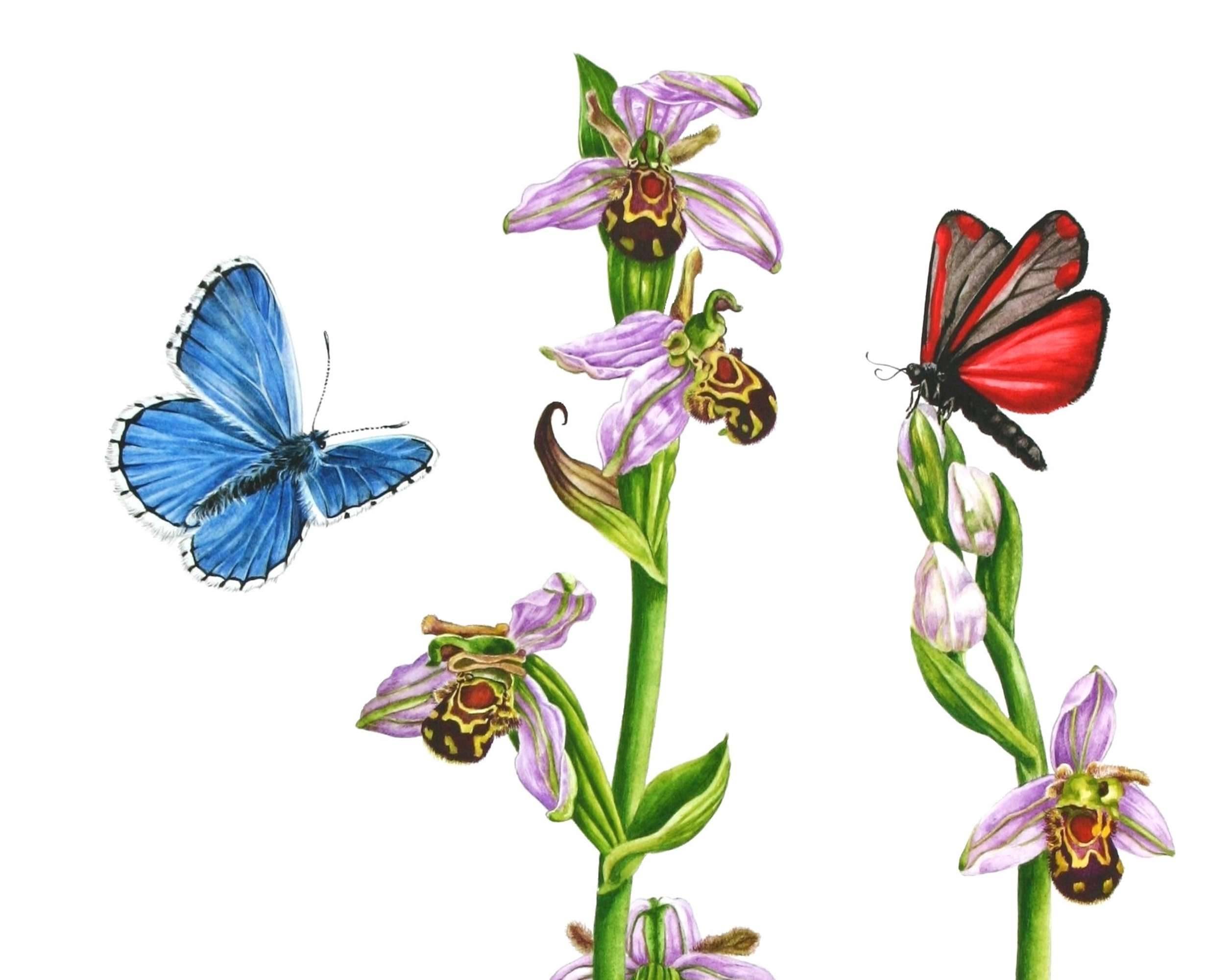 This botanical watercolour was painted using sketches and live specimens taken from a protected wild flower meadow in Norfolk. The flowers are very complex and tiny so a magnifying glass was needed. The rich vibrant colours were build up using many layers of paint.